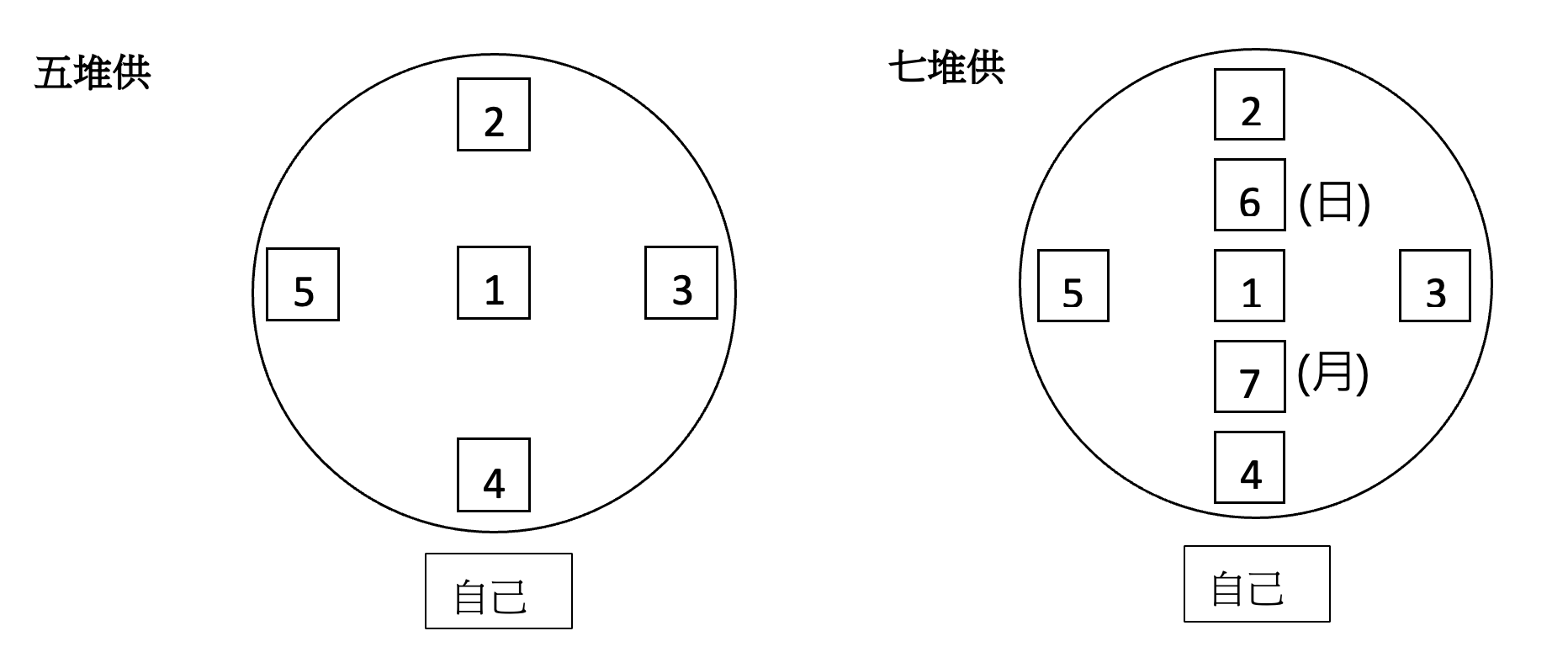 下圖顯示放置五堆與七堆供品位置與順序。